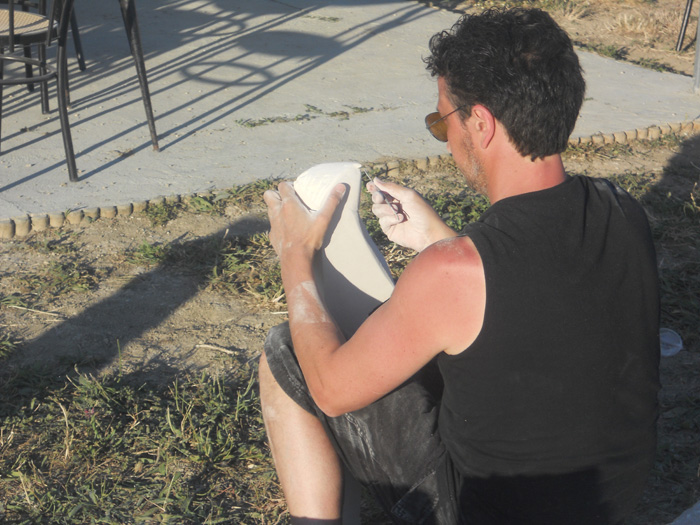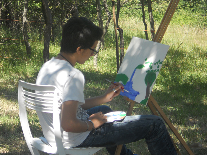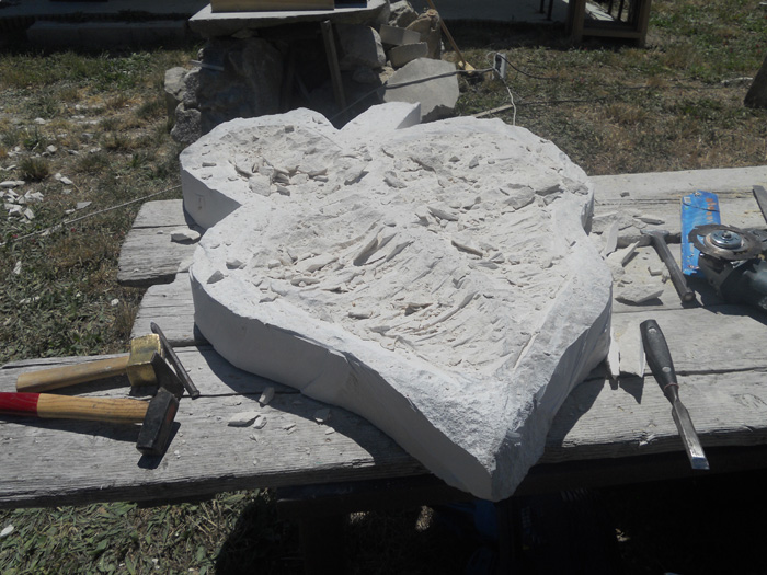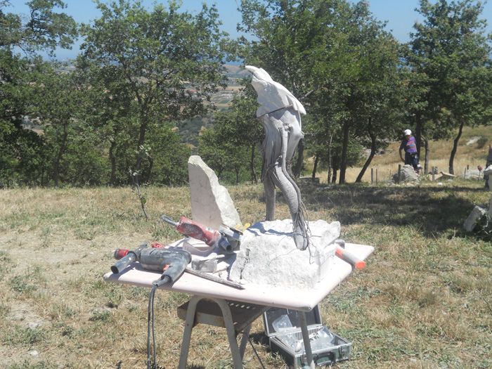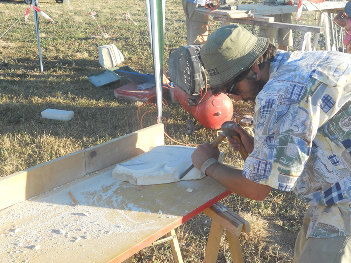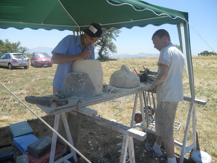 Ci troviamo nella Fattoria I Colli di Ettore Altieri di San Salvo. Un artista, oltre che un ottimo padrone di casa. Promotore di questo simposio “Arte e Natura” che ha visto la partecipazione di circa una ventina di artisti tra professionisti, giovani emergenti e bambini. Tutti proiettati verso l’espressione della propria creatività sul tema della natura. Colori acrilici, tempere, pietra, legno, elementi naturali della terra sono stati i veri protagonisti di questo evento ‘naturale’. Ognuno con il suo stile, la sua tecnica, con i suoi materiali. Ma la materia prima era lei: la Pietra della Majella. Claudio Camillo di Biase dell’Associazione A.R.A.P. (Associazione Regionale Artisti della Pietra) coordinatore insieme ad Ettore Altieri dell’evento nonché fornitore ufficiale della ‘pietra’; scalpellista da cinque generazioni nel suo laboratorio di Lettomanoppello ( Pe )e realizzatore di opere in pietra su commissione.