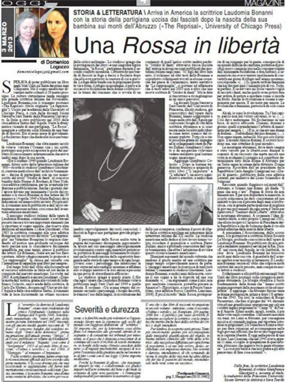 Le montagne abruzzesi, dove tanto sangue è stato versato per la libertà, sono dunque lo scenario di un racconto che mette ancora una volta in evidenza il coraggio e il contributo determinante dato dalle donne d’Abruzzo per un’Italia senza le catene della dittatura. Donne generose. Ricordate dall’ex presidente della Repubblica Carlo Azeglio Ciampi nel suo “Diario di guerra”, pubblicato dalla casa editrice Laterza, per iniziativa del Liceo Scientifico di Sulmona. Racconta quando, fuggiasco sui monti dell’Abruzzo, a Scanno una donna gli diede “il pane che non c’era”. Pagine di storia da non dimenticare. E per non disperdere la memoria, la scuola sulmonese ha dato concretezza ad una iniziativa che con il passare degli anni si irrobustisce, con la grande partecipazione di migliaia di giovani provenienti da ogni parte d’Italia per ripercorre il “Sentiero della Libertà”, attraverso le montagne abruzzesi. A sostenere l’idea diventata realtà, è stato proprio Ciampi nel 2002, che allora ricopriva l’incarico di Presidente della Repubblica e che da Sulmona diede il via alla prima edizione della marcia della libertà. A presiedere l’Associazione, dallo scorso anno, è la giornalista e scrittrice Maria Rosaria La Morgia, profonda conoscitrice dell’opera di Laudomia Bonanni. Ha pubblicato diversi articoli e realizzato numerosi servizi per la Rai. Dice:”E’ nel cuore dell’Aquila, in via Garibaldi, la casa dove Laudomia Bonanni ha trascorso molti anni della sua vita. A guardarla dall’esterno sembra aver resistito al terremoto. E Laudomia Bonanni resiste all’oblio che colpisce molti scrittori del secolo passato, anzi conquista nuovi lettori e studiosi”. Il riferimento è alla pubblicazione negli Stati Uniti del libro postumo sulla coraggiosa partigiana abruzzese. La Morgia ribadisce il ruolo fondamentale delle donne che ”hanno scritto pagine importanti della resistenza civile ed umanitaria”. E aggiunge: “In Abruzzo furono tante le donne protagoniste, prima e dopo l’8 settembre del 1943. Tra loro, le sulmonesi di Borgo Pacentrano, che fino al giugno del ‘44, daranno vita ad una grandissima operazione per salvare i soldati inglesi prigionieri al “Camp 78” di Fonte d’Amore. Erano madri, mogli, sorelle, il più delle volte umili contadine. Chilometri macinati sui treni, tra Lazio e Abruzzo, per consegnare missive al comando inglese, per riportare istruzioni ai prigionieri. Da Sulmona a Roma e ritorno per dare istruzioni ed accompagnare nella fuga giovani ufficiali che dovevano raggiungere la capitale liberata. E oggi nelle parole di una di loro, Lea Cicerone, che nel 1943 aveva appena 11 anni, si coglie la spiegazione di quel naturale altruismo che regnava tra la gente abruzzese: “La cosa più bella è che mio padre e gli altri pensavano di fare cose normali”. (di Domenico Logozzo)