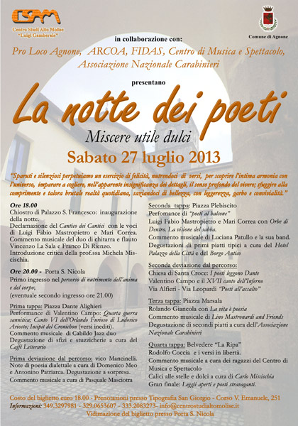 Il turismo come risorsa di sopravvivenza per territori come quello di Agnone e dell’hinterland rappresentano, da qualche tempo, l’unico barlume di speranza per l’alto Molise. Ma come fare turismo? Questa è l’annosa domanda alla quale il Centro Studi Alto Molise da tempo prova a dare risposta; è proprio in virtù di questa necessità che l’associazione culturale ha ideato un nuovo appuntamento che inaugurerà il palinsesto dell’estate agnonese : la “Notte dei poeti”.