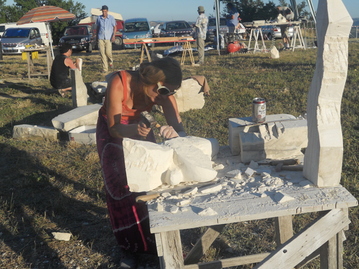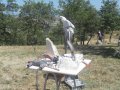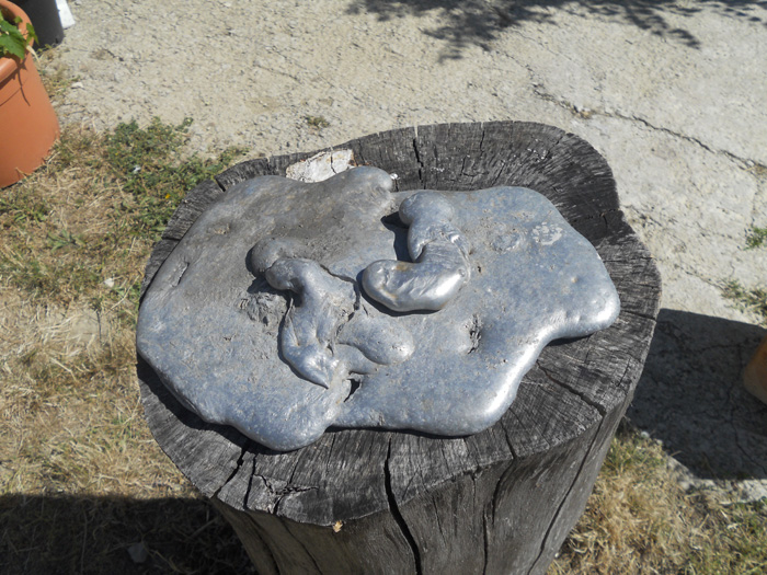 STEFANO FACCINI di Pescara ma originario di Bergamo. Ha scoperto, qui nel Centro sud, una realtà che gli ha permesso attraverso l’arte, i sapori e i paesaggi di piantare le sue radici. Mostre collettive e diversi simposi lo accompagnano nella sua escalation artistica. La sua opera “Vomito di Natura” è la fusione non solo di due materie prime (legno e pietra) ma anche di due artisti, Stefano, appunto e Marco Bevilacqua (Pe) artigiano del legno ( è la prima volta che partecipa ad un simposio e quando gli ho chiesto che cosa rappresenta la sua opera la risposta è stata tutta di un fiato:’Entità terrestre che verbalizza la natura’). “Vomito della Natura” …la natura che rigenera sé stessa!