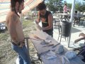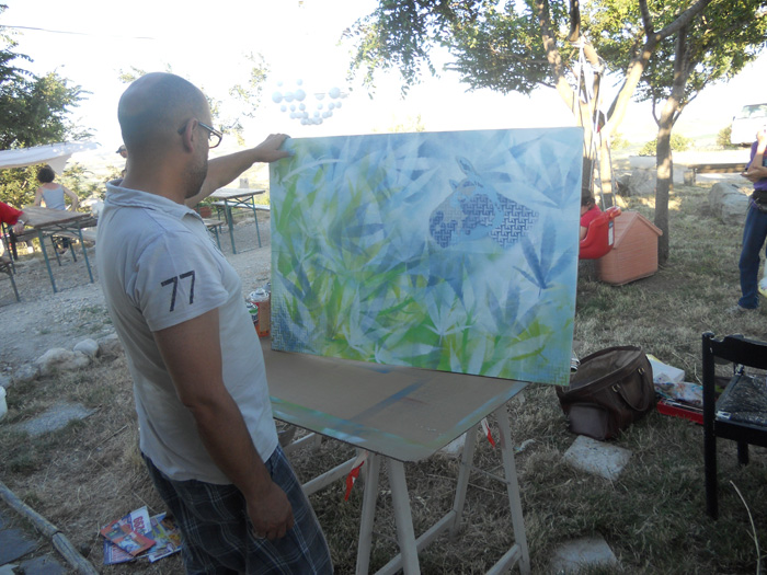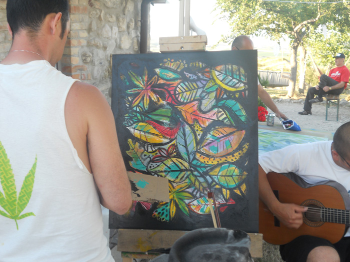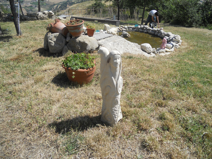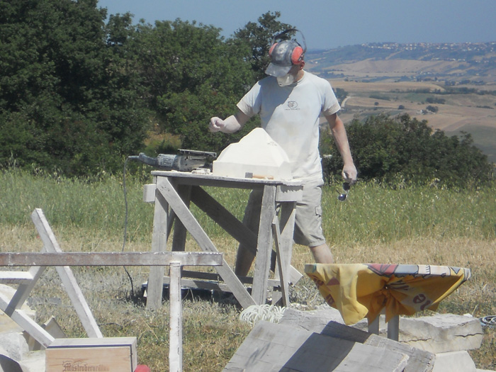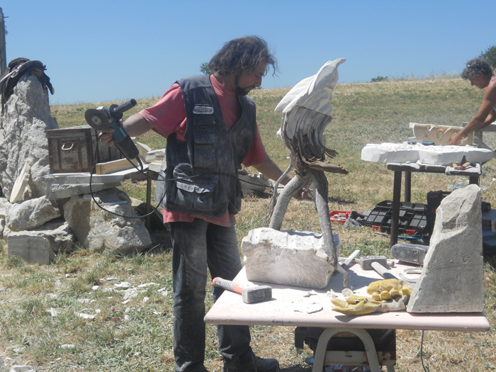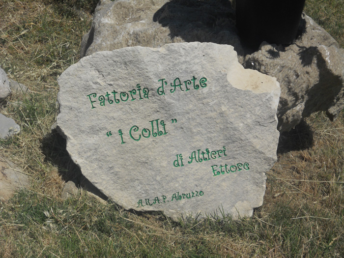 Ci troviamo nella Fattoria I Colli di Ettore Altieri di San Salvo. Un artista, oltre che un ottimo padrone di casa. Promotore di questo simposio “Arte e Natura” che ha visto la partecipazione di circa una ventina di artisti tra professionisti, giovani emergenti e bambini. Tutti proiettati verso l’espressione della propria creatività sul tema della natura. Colori acrilici, tempere, pietra, legno, elementi naturali della terra sono stati i veri protagonisti di questo evento ‘naturale’. Ognuno con il suo stile, la sua tecnica, con i suoi materiali. Ma la materia prima era lei: la Pietra della Majella. Claudio Camillo di Biase dell’Associazione A.R.A.P. (Associazione Regionale Artisti della Pietra) coordinatore insieme ad Ettore Altieri dell’evento nonché fornitore ufficiale della ‘pietra’; scalpellista da cinque generazioni nel suo laboratorio di Lettomanoppello ( Pe )e realizzatore di opere in pietra su commissione.