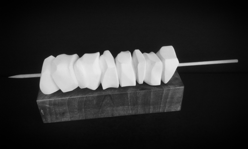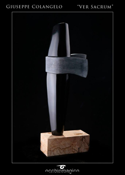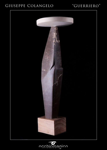 La pietra della Majella. non solo pietra bianca, calcare bianco tenero e poroso estratta dalle cave della Maiella, ma anche pietra scura, calcare grigio più duro e compatto, adatto ad essere lucidato. Sono le "pietre sonanti", quelle che scolpite nelle botteghe diffondono la loro antica musicalità. Ed è cosi che la pietra tra le mani di Giusppe Colangelo prende forma e diventa elemento decorativo a testimonianza della cultura abruzzese e non solo. La capacità di progetto, la creatività, la perfezione di linee, il genio sono alla base delle sue opere di grande valore artistico. ‘Arrosticino’ e ‘Guerriero’ un’identità abruzzese! Una tradizione che continua ! Ed inoltre la pietra denominata Noce di Guardialfiera (Cb), il marmo nero del Belgio, durezze che Colangelo modella con sapiente maestrìa.
