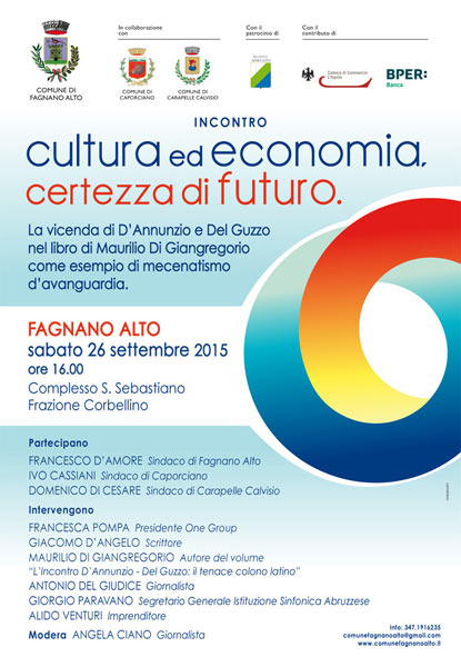 Appuntamento sabato 26 settembre 2015 ore 16.00 presso il complesso San Sebastiano nella frazione di Corbellino a Fagnano Alto, recentemente restaurato . Il tema dell’incontro - sottolinea il Sindaco di Fagnano Alto Francesco D’Amore - prende spunto dall’opera editoriale che presenteremo di Maurilio Di Giangregorio L'Incontro D'Annunzio - Del Guzzo: il tenace colono latino. Già da allora i due illustri abruzzesi, sebbene diversi, concordavano sul ruolo cruciale dell’arte e della cultura per lo sviluppo economico e sociale. Nato nel 1867 a Caporciano e cittadino di Pedicciano, il ricco mecenate Del Guzzo, emigrato in America Latina, intuisce infatti l’importanza di coniugare economia e cultura tanto da essere disposto a coprire i debiti del Vate pur di assicurarsi una serie di conferenze dell’illustre rappresentante della Cultura italiana.