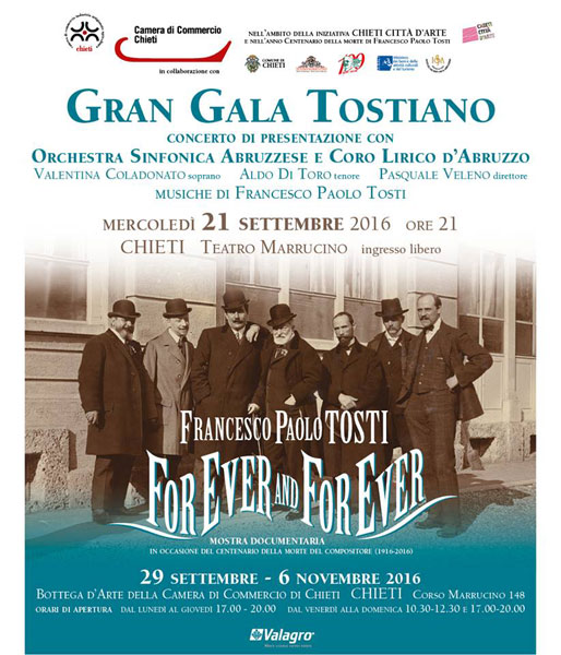 Grazie alla collaborazione dell’Istituto Nazionale Tostiano, dal 29 settembre al 6 novembre 2016, i locali espositivi della Camera di Commercio di Chieti - Bottega d’Arte ed Expo Room - ospiteranno una mostra documentaria, a cura di Gianfranco Miscia, con numerosi inediti, su Francesco Paolo Tosti dal titolo For Ever and For ever, in ricordo della sua prima romanza su testo inglese del 1879, in un percorso che racconterà diversi aspetti e luoghi artistici dell’autore e l’influenza che ha avuto sulla cultura del novecento. Con “Le opere del Cenacolo di Francavilla al Mare” sarà documentata l’influenza che l’autore ha avuto sulle opere degli altri artisti del cenacolo michettiano: Gabriele D’Annunzio, Costantino Barbella, Paolo De Cecco e lo stesso Francesco Paolo Michetti. Sul tema molto si è scritto; quello che invece tentiamo di fare con la mostra è, invece, far parlare le stesse opere per capire cosa concretamente ha potuto significare l’esperienza del Cenacolo. Con la sezione “Le celebrazioni tostiane in Abruzzo nel Novecento” ripercorreremo invece i momenti celebrativi tostiani che si sono svolti in Abruzzo nell’arco del secolo scorso che testimoniano quanto celebrare Tosti abbia avuto un ruolo considerevole nella formazione culturale d’Italia come una sorta di “collante” non solo per la comunità ortonese, ma per l’intero ambiente abruzzese. Ed ancora la sezione dedicata alle corti, italiana ed inglese, dove egli potè esercitare la sua attività di maestro di corte e gli altri documenti esposti che rappresentano l’evidenza del ruolo del compositore nel mondo musicale e culturale europeo a cavallo tra ‘800 e ‘900.