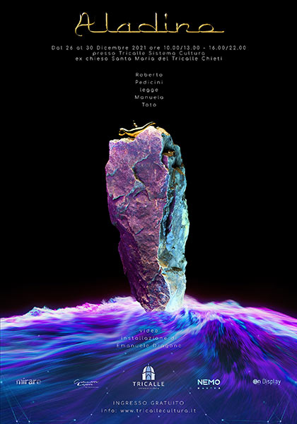 Durante le festività natalizie, dal 26 al 30 dicembre 2021, tutti i giorni dalle 10.30 alle 13 e dalle 16 alle 22, il nuovo centro di produzione culturale di Chieti, Tricalle Sistema Cultura, regalerà la magia del desiderio con Aladino: un'installazione video e audio interattiva ideata da Nemo Introspezione e Arte, proposta in collaborazione con Mirare, realizzata da Emanuele Dragone, graphic designer, video maker e illustratore, scritta da Manuela Toto, scrittrice, consulente familiare, esperta in fiaba terapia, narrata dalla celebre voce di Roberto Pedicini, attore, doppiatore e conduttore radiofonico italiano, vincitore del premio per il miglior doppiatore ai Nastri d’argento 1999 per i film The Truman Show e Celebrity, e supportata dalla tecnologia di OnDisplay. L’installazione dialogherà con i paralumi dell’artigiano Giammarco Capanna, pietre preziose del giardino sotterraneo in cui è collocata la famosa lampada.