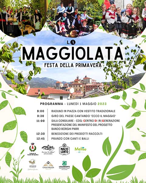Il 1° maggio 2023 a Castel del Giudice (IS) è la Festa della Maggiolata, rito propiziatorio che celebra la primavera e al risveglio della natura, occasione, quest’anno, anche per presentare il manifesto del progetto relativo al Bando Borghi, per il quale il Comune ha ottenuto un finanziamento di 20 milioni di euro sui fondi del PNRR dal Ministero della Cultura. La giornata comincerà alle 9.00, con il raduno in Piazza Marconi, dove ragazzi e ragazze vestiti con gli abiti del folklore locale si incontreranno per intraprendere il tradizionale giro del paese, portando rami di faggio in mano ed intonando il canto della Maggiolata “Ecco il maggio”. Un rituale gioioso e coinvolgente, che nella cultura contadina, radicata in Alto Molise, ha il significato di augurare una buona annata per il raccolto. I giovani vanno di casa in casa, ricevendo dagli abitanti di Castel del Giudice prelibatezze, per poi tornare in piazza intorno alle 12.30 per procedere con la benedizione dei prodotti, che vengono trasformati in piatti da condividere con la comunità con un pranzo tra musica e balli, a cui tutti possono partecipare. La Maggiolata, infatti, è un’occasione unica per vivere la festa tradizionale più caratteristica di Castel del Giudice, in un luogo che ha fatto dell’agricoltura sostenibile e della rigenerazione del territorio un mantra. Di qui il legame con il manifesto del progetto del Bando Borghi, che sarà presentato alle ore 11:00 nella sala consiliare del Comune di Castel del Giudice, dal sindaco Lino Gentile, dalla professoressa Letizia Bindi del Centro di Ricerca BIOCULT dell’Università degli Studi del Molise, e da Livio De Santoli, prorettore per la sostenibilità dell’Università degli Studi di Roma.