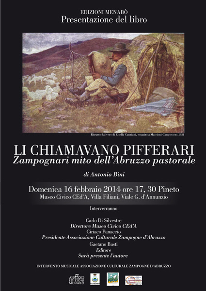 Il libro sarà presentato domenica 16 febbraio alle ore 17,30 a Pineto presso il Museo della musica popolare abruzzese (Museo Civico CEd'A nella Villa Filiani Via G. d'Annunzio) ed interverranno Carlo Di Silvestre Direttore del Museo Civico CEd’A, Ciriaco Panaccio, Presidente dell’Associazione Culturale Zampogne d’Abruzzo e Gaetano Basti Editore della Menabò. La presentazione sarà accompagnata da un intervento musicale a cura dell’Associazione Culturale Zampogne d’Abruzzo.