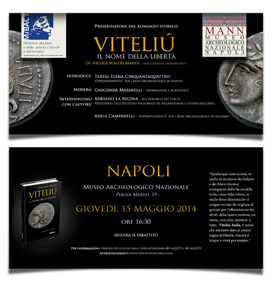 Giovedì 15 maggio, presso la Sala conferenze del più prestigioso fra i musei della civiltà classica, Nicola Mastronardi presenterà il libro che svela le origini della Nazione “Italia” e tenta di colmare un buco nero nella cultura nazionale: 'Vitaliù. Il nome della libertà' - Sala conferenze- Museo Archeologico Nazionale di Napoli - Piazza Museo 9 - ore 16.30