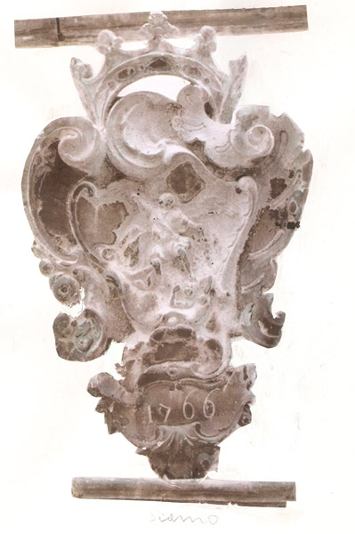 Quattro sono pure gli svolazzi della cimasa. Sovrasta la chiave dell'arco un ricco stemma di chiara fattura rococò. Al centro dello stemma, troneggia l'immagine di San Michele, ripreso durante la lotta con Satana. Ai piedi del santo è incisa la data, che, presumibilmente, indica la fine dei lavori del palazzo.
