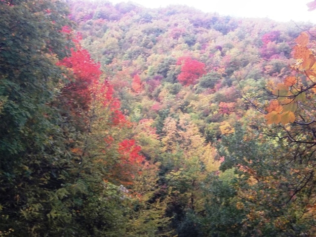 L’ampio panorama ti obbliga a fermarti e osservare a sud/ovest, la valle dell’Orfento, con il visibile sentiero della Rava dell’Avellana che arriva al Ponte della Pietra, a nord il vallone di Santo Spirito con l’eremo e ad est il mare. Il Blockhaus, con i suoi 2142 m, ci protegge e si gode dall’alto questo panorama! Lo sguardo non può tralasciare lo scenario delle foglie dei faggi che assumono vari colori, con diverse tonalità. Un esploso meraviglioso di colori cromatici INDIMENTICABILI, che vanno dal marrone bruciato, al giallo, al verde, al ruggine, in conseguenza dell’altezza. A quota 1530 m c’è l’indicazione per l’eremo/grotta di san Giovanni. Mi torna in mente che ho percorso questo sentiero tanti anni fa. In genere è più frequentato il sentiero più a valle.