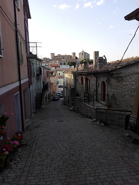 Giunti a Torella del Sannio e con la faciltà di un immediato parcheggio ( è impossibile per chi vive in città) ci incamminiamo verso la parte alta e antica del paese con il Castello e la Chiesa di San Nicola che lo dominano. Nella piazzetta che precede l’ingresso al borgo antico, la Pro Loco ‘Tre Torri’ rilasciava tickets ed un’artigianale sacca con bicchiere per intraprendere un percorso enogastronomico. Saliamo su per i vicoli scoscesi con una piccola mappa itinerante che localizzava i vari punti di degustazione, o per meglio dire, di portate abbondanti della tradizione molisana con vino e acqua a volontà: pezelelle e fasciuol, z’ppetta, panonda, macciuocche, ova e pancetta, scattone, pasticcio incantato. Tra un ‘assaggio’ e l’altro ci dirigiamo verso il Castello Casa-Studio-Museo della pittrice-musicista Elena Ciamarra, che fu venduto nel 1815 dai Caracciolo ai Ciamarra, i cui eredi ne abitano ancora (nei mesi estivi) l’ala più antica. Ed è qui che il tempo, all’improvviso, scorre all’indietro. Ci accolgono Leonardo Cammarano artista, filosofo e saggista, figlio della pittrice, e la moglie Angela Piscitellii, Due persone squisite, affabili, ospitali che vivono a cavallo tra Borgogna, in Francia, e Torella del Sannio. Seduti alla loro tavola e gustando formaggi, pizza salata (tipo casatiello napoletano) ed una crostata di frutta rigorosamente prodotta a Torella, entriamo nella magica atmosfera del Castello attraverso il racconto dei padroni di casa. Senza tanti formalismi, Angela ci conduce nelle varie stanze dove la pittrice dava voce alla sua arte. Quadri e quadri che riempiono le pareti raffiguranti gente del luogo, contadini la campagna di Torella, oltre ad altre cinquemila opere non visibili per mancanza di spazio. Ed erano ancora lì il suo cavalletto, la tavolozza , il pianoforte Steinway, perché Elena Ciamarra era anche pianista e violinista. Stretti gradini a chiocciola ci conducono su per la torre dove un camino ed un’antica culla originale ancora dondolante al calduccio nelle fredde notti invernali…. Dopo esserci accomiatati, proseguiamo , con il bicchiere di vino in mano, verso la Casa del Contadino, piccola, essenziale, rudimentale, contadina, con le sue ragnatele e le masserizie dell’epoca. Non sono mancati i mercatini con prodotti locali come il miele di Sulla, il Topinambur sott’olio, l’ oggettisitca, i salumi e formaggi del luogo oltre alla compagnia del gruppo folkloristico di Campobasso, la Polifonica Monforte con abiti tradizionali dei primi del ‘900, nonché quella delle Tre Torri, giovani che in dialetto cantavano accompagnati dall’organetto, il bufù e una variante del triccheballacche.