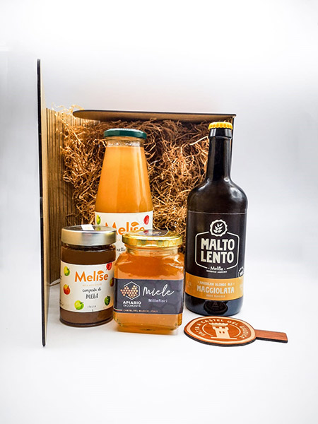 Nella confezione, che può essere spedita in tutta Italia, c’è una bottiglia di Nettare di Mela (720 ml) con succo al 30% e nettare al 50% e una Confettura di Mela (220ml) dell’azienda agricola biologica Melise, una birra agricola “Maggiolata” del birrificio Malto Lento in stile American Blonde Ale 4,3% (0,50 cl) e un barattolo di Miele millefiori dell’Apiario di Comunità di Castel del Giudice (440 gr). Le composte di mele e i succhi di frutta nascono dai meleti biologici Melise, coltivati a Castel del Giudice, dove i terreni un tempo abbandonati sono stati recuperati per dare vita a 40 ettari destinati all’agricoltura biologica. Sono state recuperate anche varietà di mele autoctone molisane e abruzzesi, che si possono ammirare nel Giardino delle Mele Antiche. Gli alberi di melo sono impollinati dalle api dell’Apiario di Comunità da cui nasce il Miele millefiori espressione della biodiversità floreale dell’Appennino altomolisano e abruzzese. È un miele speciale, perché ha origine da un progetto di cooperazione, che oggi unisce più di 30 apicoltori e apicoltrici, e che rilancia tutta l’area interna in chiave sostenibile, in una zona dove la natura è regina e ispirazione. Vicino ai meleti e alle api cresce l’orzo con cui si produce la prima birra agricola dell’Alto Molise: Malto Lento. Il nome “Maggiolata” e deriva dalla tradizionale festa della primavera che si svolge ogni 1° maggio a Castel del Giudice ed è quindi un augurio di rinascita.