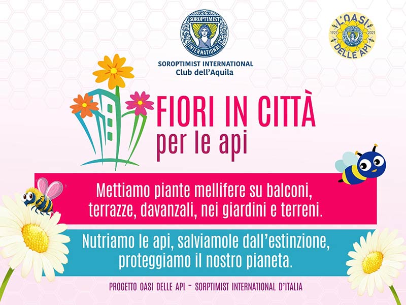 Il Soroptimist Club dell’Aquila, nell’ambito di questo progetto, ha lanciato la campagna “Fiori in città per le Api”, invitando la popolazione a mettere piante mellifere sui propri balconi, nei giardini e nei terreni. “Abbiamo anche fatto richiesta all’Assessorato all’Ambiente del Comune dell’Aquila - dice Francesca Pompa, Presidente Soroptimist L’Aquila - di aderire all’iniziativa, concedendo una rotonda idonea alla piantumazione di fiori per le api, donati dal Soroptimist, che è stata identificata in quella situata sulla Statale 17 con lo svincolo a Via di Pile.”