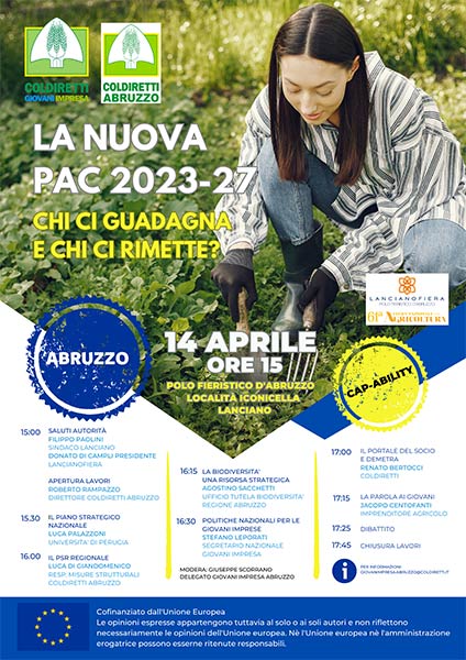 Sempre venerdì 14 aprile, alle 15, nella sala conferenze dello stesso padiglione, appuntamento con il convegno “La nuova Pac: chi ci guadagna e chi ci rimette?” in cui verrà illustrata la riforma della politica agricola comunitaria e i suoi riflessi sull’Abruzzo. Dopo i saluti del sindaco di Lanciano Filippo Paolini e del presidente di LancianoFiera Donato Di Campli, si susseguiranno gli interventi del Direttore regionale di Coldiretti Roberto Rampazzo e le relazioni tecniche di: Luca Palazzoni (università di Perugia) sul piano strategico nazionale; Luca Di Giandomenico (responsabile misure strutturali di Coldiretti Abruzzo) sul Piano di sviluppo regionale abruzzese; Agostino Sacchetti (ufficio tutela biodiversità della Regione Abruzzo); Stefano Leporati (segretario nazionale di Coldiretti Giovani Imprea) sulle politiche nazionali per i giovani agricoltori; Renato Bertocci (coldiretti) sull’app Demetra; Jacopo Centofanti, imprenditore agricolo, con una testimonianza sulla sua realtà aziendale e l’utilizzo di un nuovo software per le aziende socie. Modererà Giuseppe Scorrano, delegato regionale di Coldiretti Giovani Impresa.