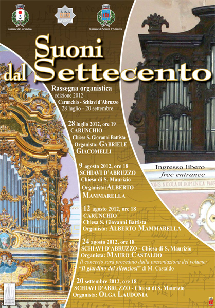 Nonostante il periodo di crisi economica, consapevoli dell’importanza del sostegno alle iniziative culturali e quelle proposte che tendono anche a rivitalizzare i centri minori dell’entroterra abruzzese, le due amministrazioni – sempre col sostegno della Fondazione Carichieti – hanno organizzato ben 5 concerto d’organo che anno preso il via lo scorso 28 luglio nella chiesa di S. Giovanni Battista di Carunchio e si sono conclusi il 20 settembre a Schiavi d’Abruzzo nella Chiesa di S. Maurzio. La direzione artistica, anche quest’anno, è stata affidata al M° Alberto Mammarella.