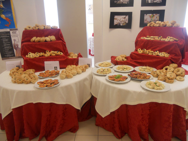 Il Pane come identità religiosa affonda le sue radici negli aspetti devozionali del culto. Come il culto di San Biagio in Abruzzo, protettore della gola, la cui festività è sovente caratterizzata dall'uso del pane, che assume forme a ciambella o tarallo ad indicare, appunto, l’annodo all’aspetto sacro e che viene ingoiato e pertanto benedetto. Ancora le ‘panicelle’ di San Biagio (prodotte a Taranta Peligna), forme di pane che presentano delle scanalature che possono indicare sia le dita del Santo sia il pettine di ferro che veniva usato per togliere le impurità dalla lana , nonché strumento di martirio di San Biagio. Della vita sociale e religiosa dell'antichità viene messo a fuoco soprattutto il pasto sacrificale, in cui si intrecciano la rievocazione di antichi rituali collettivi, la riaffermazione delle gerarchie sociali, il rapporto di comunicazione e scambio con il divino.