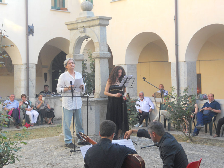 Ad Agnone la prima edizione de ‘La notte dei poeti’ che si è svolta sabato 27 luglio ed organizzata dal Centro studi Alto Molise in collaborazione col Comune di Agnone, la Pro Loco, l’Arcoa e la Fidas, ha rappresentato un evento originale e multisensoriale attraverso le vie del borgo medioevale della ridente cittadina molisana. ‘ Un percorso di nutrimento dell’anima e del corpo ‘per confermare le parole del Presidente del Centro Studi Alto Molise Ida Cimmino, che ha visto la declamazione del Cantico dei Cantici con le voci dei poeti Luigi Fabio Mastropietro e Mari Correa nella cornice del chiostro di San Francesco sul commento musicale di Vincenzo La Sala, chitarra e Franco Di Rienzo, flauto. Il poeta Valentino Campo nella chiesa S.Croce ha declamato il XVII Canto dell’Inferno in stile Benigni ed ha accompagnato i viandanti con versi inediti del Cronichon ed assaggi del VI canto dell’Orlando Furioso. Non sono mancate le poesie dialettali, un patrimonio da conservare, ad opera di Domenico Meo e Antonino Patriarca. Molto suggestiva è stata l’interpretazione di ‘Orbe di dentro’ che ha visto Luigi Mastropietro e Mari Correa sul balcone dell’hotel Palazzo della Città. Note poetiche che si accompagnavano a note gustative. Di ottima fattura la performance teatrale del giovane poeta Rolando Giancola che ha introdotto i viandanti in un viaggio tra la poesia del passato e del presente.