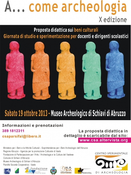 Il Centro Sperimentale di Archeologia con le sue sedi di San Salvo, Monteodorisio e Schiavi d’Abruzzo (CH) organizza, con la collaborazione dell’Agenzia per la Promozione Culturale di Vasto, la X edizione di “A… come archeologia”, giornata di studio e sperimentazione per docenti e dirigenti scolastici.