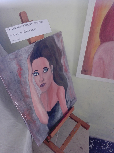 Angelica Pinnella classe 1997, una giovane artista in erba di Schiavi di Abruzzo (Ch). Passando per il centro storico incontro Angelica sull'uscio di un locale adibito a piccolo e rustico vernissage. Decido di fermarmi, entro e mi giro lentamente a 360 gradi . Volti di donna ruotavano intorno. Angelica , diplomata al Liceo classico, è alla ricerca della strada da percorrere per creare il suo futuro. Fortemente combattuta tra due discipline artistiche, l’arte come pittura e il cinema come regista, al momento esprime ciò che sente, ciò che le piace, su tela. Una propensione che si è manifestata fin dalle elementari, con richieste dirette. Se un’immagine la colpiva chiedeva alla madre di disegnarlela. E chissà se qualche noto artista ha iniziato così il suo cammino!! Crescendo ha iniziato a sperimentare le sue potenzialità e avendo a disposizione pochi strumenti, si dilettava a dipingere a grandezza desiderata, unendo sapientemente fogli per realizzare un ‘unica ‘tela’. Occhi, occhi di donna, visi di donna, la sua inclinazione. I volti di fantasia o riproduzioni di foto, che hanno un comune denominatore: il colore, azzurro e verde espressione di tranquillità, serenità, speranza.