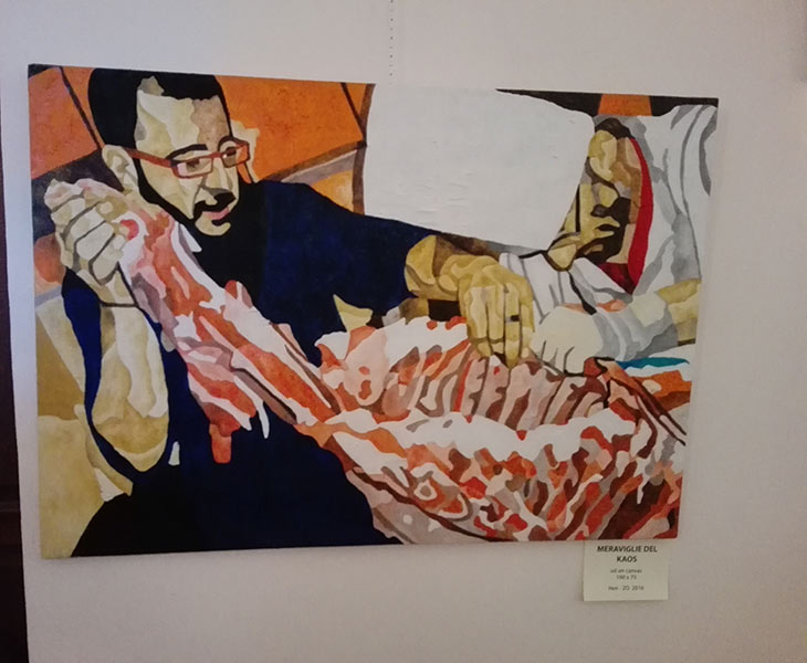 Un particolare che mi ha colpito in più di un quadro, è quel concentrato di azzurro con le sue sfumature che va’ a delineare qualcosa o qualcuno di inesistente, d’immaginario ma reale. Un esserci e non esserci al tempo stesso e che si integra perfettamente nella totalità del dipinto. Ma in assoluto quello che ho trovato particolarmente vivido, espressivo, sentito è Hen-ZO e Kaos e la loro meraviglia. (e la mia meraviglia). Bellissimo!!!