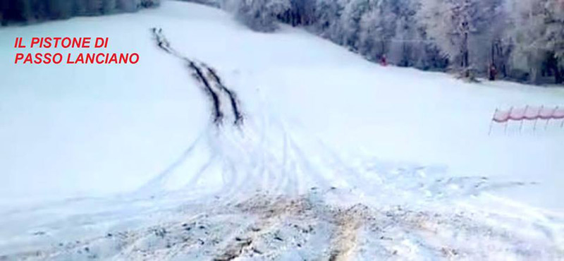 Torniamo sulla strada provinciale 64 ed arriviamo dopo un paio di chilometri alla sbarra, dove inizia una carrareccia che porta allo stazzo di Roccamorice (1509 m). Anche qui approfittiamo per goderci il sole ed il panorama. Colpisce il silenzio assoluto. Non incontriamo nessuno. Una piccola pausa per iniziare la salita di Colle Remacinelli che ci fa chiudere l’escursione a Fonte Tettone. Purtroppo gli amanti delle avventure estreme… con le loro potenti vetture, hanno solcato la neve e rovinato il terreno. A Passo Lanciano, una vettura ha cercato di salire la pista di sci del Pistone, arrendendosi ad un certo punto per la ripidità del tracciato. Un atto vandalico irresponsabile, su un’area protetta, da punire!