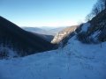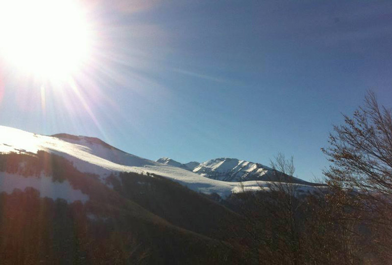 La giornata soleggiata ci ha consigliato la montagna. La Maiella è l’unica montagna imbiancata, ma abbiamo preferito portare le ciaspole. Arrivati a PassoTettone (1654 m) nella località Maielletta, abbiamo constatato che la neve era poca e ghiacciata. Quindi la decisione delle ciaspole si è rivelata vincente. Decidiamo una escursione ad anello con partenza da Passo Tettone e seguendo il sentiero dell’acquedotto, siamo arrivati alla Presa D’Acqua di Fonte Tettone (1550 m), a Colle Tondo. Il panorama è infinito, ed unisce il vallone di Santo Spirito, (con la visuale dell’eremo appoggiato alla parete, dove Pietro da Morrone vi dimorò nel 1246), con le pareti di arrampicata di Roccamorice PE, il Gran Sasso, il mare. Gli occhi si riempiono alla vista di questo spettacolo e c’è soddisfazione.