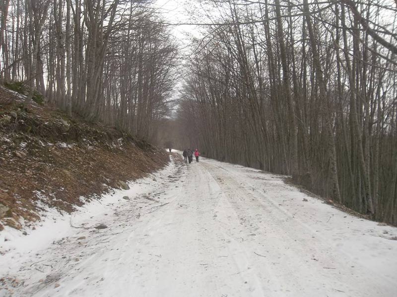 Dalla strada asfaltata (1140 m) si arriva alla radura (1550 m). Si scende al rifugio FONTE DELLA CHIESA (1500 m) dove ci siamo scaldati ed un po’ asciugati accendendo il caminetto. Proseguendo si arriva sulla strada (1450m). Un chilometro per raggiungere l’attacco alla RAVA DEL FERRO (1500 m). Il ritorno sotto una fitta nevicata, chiudendo l’anello ad uno dei diversi sentieri accessibili realizzati per i diversamente abili o meglio ai portatori di disabilità.