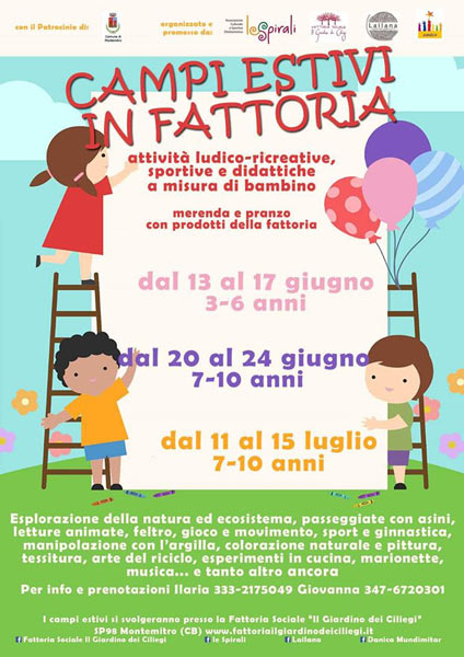 La sinergia tra la Fattoria Sociale "Il Giardino dei Ciliegi" di Montemitro (Cb), azienda agricola multifunzionale che svolge attività socio-educative con bambini e famiglie, attività riabilitative e terapeutiche con disabili, persone svantaggiate e anziani e l’associazione culturale/sportiva dilettantistica ‘Le Spirali’ che tiene corsi, attività e laboratori per bambini ed adulti, ha prodotto un evento che li vede impegnati in un progetto per bambini dai 3 ai 10 anni. Tre settimane distinte (la prima per i bambini 3-6 anni, le altre due per i bambini 7-10) a contatto con la natura e gli animali della fattoria. Momenti educativi dove i bambini potranno dedicarsi alla cucina, alla realizzazione di manufatti con l’argilla, alla colorazione naturale, alla narrazione con letture animate. E ancora passeggiate con gli asini, giochi , l’arte del riciclo, il mondo delle marionette e tanto altro.