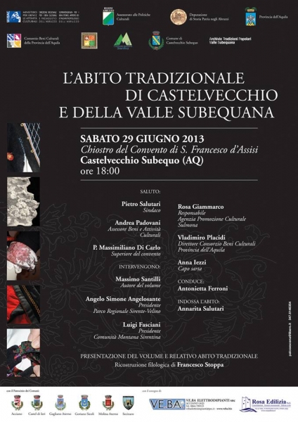 Domani 29 giugno , il Chiostro del Convento di San Francesco a Castelvecchio Subequo (Aq) ospiterà la presentazione del libro ” L’abito tradizionale di Castelvecchio e della Valle Subequana” la nuova ricerca dello studioso di tradizioni popolari Massimo Santilli, con l’introduzione e la ricostruzione filologica a cura del professor Francesco Stoppa, dell’Università di Chieti . Una pagina di storia popolare inesplorata che riporta in luce , attraverso l’abito tradizionale (foggia femminile festiva in versione estiva)le specificità, i tratti salienti e significativi di una comunità omogenea qual è la Conca “Superequana”. ,. Il volume, pubblicato da Synapsi Edizioni in una pregevole veste grafica realizzata da Elia Santilli, presenta anche un ricco corredo fotografico d’epoca. Una riproduzione dell’abito ad opera di Anna Iezzi sarà il fiore all’occhiello dell’evento culturale.