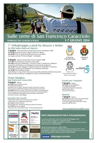 E’ tutto pronto per la settima edizione del pellegrinaggio a piedi “Sulle orme di S. Francesco Caracciolo”, ideato nel 2008 dai Chierici Regolari Minori (Padri caracciolini) in occasione del quarto centenario della nascita al cielo del loro Santo Fondatore (4 giugno 1608). Dal 1 giugno al 7 giugno 2014 . Questa edizione si è arricchita anche di un concorso interno dell’Istituto Alberghiero di Villa Santa Maria, che ha avuto per oggetto la realizzazione del “panino del pellegrino”, facendo riferimento alle antiche ricette locali e ai prodotti del territorio.