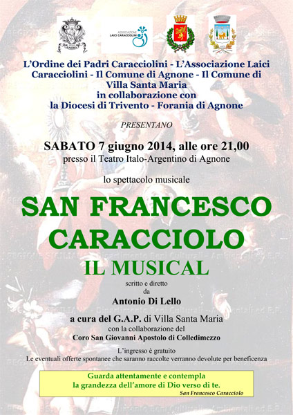 ° il giorno 7 alle ore 21 presso il Teatro Italo Argentino in Agnone, con la collaborazione della Forania di Agnone e della Diocesi di Trivento, ci sarà la rappresentazione del musical “San Francesco Caracciolo”, che racconta con un linguaggio moderno e coinvolgente la vita del Santo abruzzese (ingresso libero).