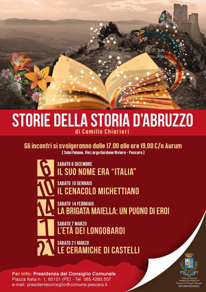 L'Abruzzo ha una grande Storia appassionante ed importante. Però molto spesso l’epopea romantica ed epica della nostra gente non è conosciuta e raccontata, tanto che gran parte degli abruzzesi la ignora completamente. Una serie di appuntamenti che vede nelle ‘Storie della Storia d’Abruzzo’ un ciclo di conferenze tenuto da Camillo Chiarieri , ci permetterà di seguire ed osservare, attraverso i secoli, l’evoluzione del pensiero umano, dell’arte, della letteratura.