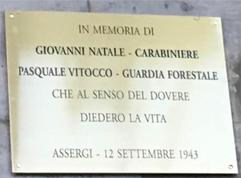 Un episodio storico che si consumò ad Assergi, che scosse la nostra comunità. "Assergi Racconta" ha ricostruito la vicenda, attraverso le testimonianze dei figli del Vitocco e del soccorritore Costanzo Alloggia. Si trattò di un'azione di guerra, un'azione coordinata nella quale reparti di terra si incaricarono di spianare la strada per facilitare l'atterraggio a Campo Imperatore degli alianti che portavano i soldati che avevano il compito di liberare il Duce. Le truppe tedesche al comando del Maggiore Mors, viaggiavano sulla strada che porta a Fonte Cerreto dove è situata la stazione di partenza della Funivia per Campo Imperatore. L’avanguardia della lunga colonna motorizzata, costituita da motorette munite di mitraglia, costrinse alla resa un drappello di carabinieri che presidiava la strada verso la Base della Funivia. Un carabiniere, per l'appunto il Natale, rimase ucciso, non essendosi accorto che tutto il drappello si era arreso senza nemmeno sparare un colpo. In un pagliaio poco distante una guardia campestre, Pasquale Vitocco, avvedutosi del trambusto e temendo forse per sé e per la sua famiglia, pensò di uscire e di allontanarsi attraverso un viottolo che conduceva al paese (alla Porta del Colle, per essere precisi), ma alcuni soldati tedeschi lo avvistarono e, temendo, a motivo della divisa di guardia forestale che indossava, che avesse intenzione di chiamare rinforzi, gli spararono, ferendolo gravemente. L'episodio avveniva ad Assergi, all'altezza della località detta Fraunil. Soccorso poi da Costanzo Alloggia e dalla moglie che subito lo raggiunse, fu condotto alla casa della maestra Battista Sacco, in prossimità della Porta dell'Orologio. Successivamente fu portato all'ospedale dell'Aquila su di una camionetta degli stessi soldati tedeschi, che nel frattempo si erano resi conto del tragico errore, ma il mattino dopo Vitocco spirò.