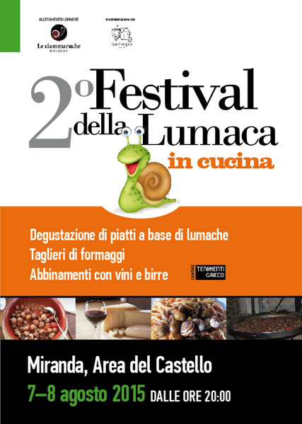 Il 7 e l’8 agosto alle 20.00, in occasione del 2° Festival della Lumaca, a Miranda, nell’area del Castello, si potranno gustare cinque diverse portate preparate sapientemente per far riscoprire un prodotto sano e naturale.