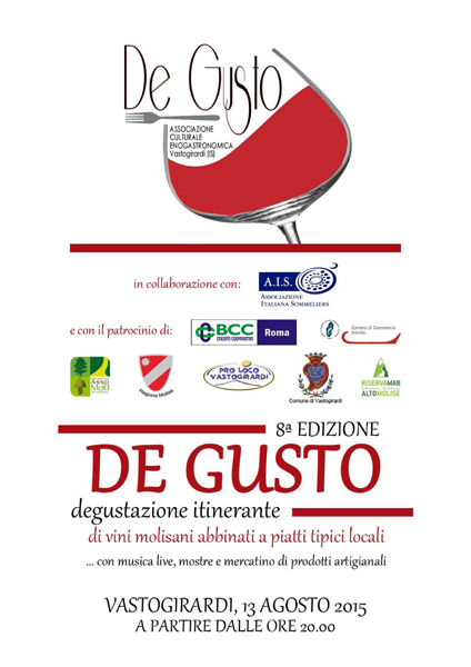 Torna 'De Gusto', la manifestazione enogastronomica giunta alla sua ottava edizione e organizzata a cura dell’ l'Associazione Culturale Enogastronomica "De Gusto" in collaborazione con l’AIS (Associazione Italiana Sommelier) e con il patrocinio della Banca di Credito Cooperativo di Roma, Camera di Commercio di Isernia, Consorzio Assomab Alto Molise, Regione Molise, Proloco e Comune di Vastogirardi e Riserva MAB Collemeluccio-Montedimezzo Alto Molise. La manifestazione del 13 agosto, nasce per riscoprire il rapporto con il cibo come un momento culturale che trae origine dalle nostre tradizioni e per sensibilizzare a selezionare con attenzione ed intelligenza ciò che portiamo sulle nostre tavole.