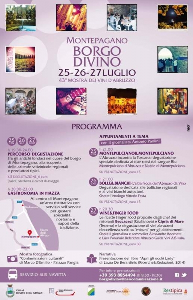 La quarantatreesima mostra dei Vini d'Abruzzo quest’anno si svolgerà dal 25 al 27 luglio nel centro storico di Montepagano. Proporrà un inedito e storico confronto tra il Nobile di Montepulciano e il Montepulciano d’Abruzzo, due regioni a confronto. due grandi vini uniti nella diversità che dialogheranno tra loro in un percorso di conoscenza, valorizzazione e condivisione. Degustazioni, wine show ed incontri con esperti e giornalisti di settore consentiranno ai due top wines di andare oltre il legame (l’identità tra il nome del vitigno dell’abruzzese e la “patria” esclusiva del toscano), che li unisce, e di “raccontare” – attraverso i loro produttori – l’unicità e le diversità che li contraddistinguono, e che da sempre sono “marchio di garanzia” per entrambe le produzioni.