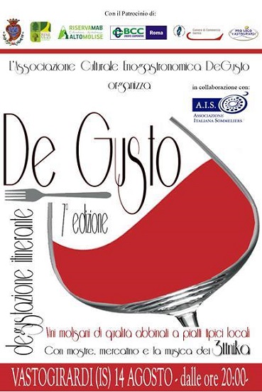 Nello splendido scenario del centro storico di Vastogirardi in provincia di Isernia, torna "De Gusto", l'ormai tradizionale manifestazione enogastronomica, giunta quest’anno alla VII edizione. Un percorso del gusto lungo i vicoli e le piazze del borgo antico di Vastogirardi il 14 agosto alle 20.00. Un viaggio enogastronomico attraverso i sapori del Molise, che si concluderà in piazza Giusto Girardi, all’interno del Castello Medievale. Sei cantine allieteranno il percorso con degustazione di vini ed assaggi di prodotti tipici locali; inoltre verranno allestite mostre tematiche di artisti vastesi e un mercatino itinerante di prodotti artigianali. La musica accompagnerà chi nel percorso si incamminerà!