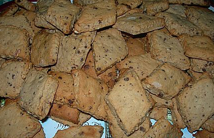 Questi biscotti sono una specie di dure gallette dolci e l’ingrediente principale è il mosto cotto. Si prelevava la quantità di mosto, lo si poneva in un paiolo di rame nel camino e dopo molte ore di bollitura, rimestando pazientemente, quando il liquido era ridotto ad un terzo, era pronto il mosto cotto. Si metteva un po’ di farina su una spianatoia, si aggiungeva il mosto ancora bollente, un po’ di veloce manualità, una breve attesa per la cottura ed i biscotti erano pronti. Si masticano lentamente data la compattezza della loro pasta dalla quale, all’improvviso, si sprigiona un bouquèt di aromi.