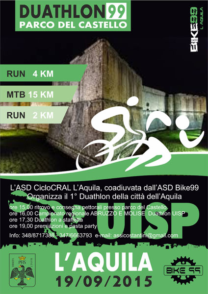 Programma L’Aquila sabato 19 settembre: ore 15,00 ritrovo e consegna pettorali presso parco del Castello; ore 16,00 duathlon individuale; ore 17,30 duathlon a staffetta; ore 19,00 prestazioni e pasta party.