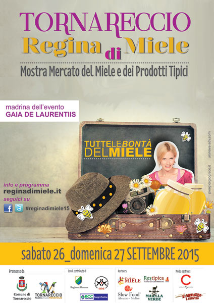 Tutte le bontà del miele! Per il tredicesimo anno Tornareccio, la capitale abruzzese del miele, mette in vetrina le mille anime della sua indiscussa Regina. Sabato 26 e domenica 27 settembre 2015, una nuova edizione di Tornareccio Regina di Miele, il più importante evento abruzzese dedicato al miele e ai prodotti dell'alveare, con stand, degustazioni, incontri, spettacoli, animazione, cooking show e molto altro.