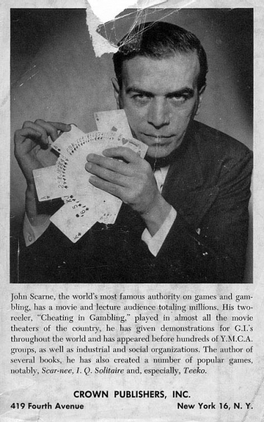 Iniziò a scrivere libri, in tutto saranno ventotto, e tra i più venduti “Scarne on Dice”, “Scarne's Guide to Modern Poker” e “Scarne's New Complete Guide to Gambling”. Scrisse due autobiografie: “Il fantastico mondo di John Scarne: una storia personale” (1956), e “Le probabilità contro di me” (1966). Fondò una società, la John Scarne Games, Inc., per la creazione di nuovi giochi ed in particolare fu orgoglioso di quello chiamato Teeko. Era così fiero del gioco tanto da chiamare suo figlio (avuto dal matrimonio con Steffi Norma Kearney) Giovanni Teeko Scarne (il ragazzo morirà, nel 1981, a soli 25 anni lasciano in Scarne un incolmabile dolore). Il gioco Teeko si diffuse rapidamente in tutto il mondo ed ebbe tra le più appassionate giocatrici la grande Marilyn Monroe.
