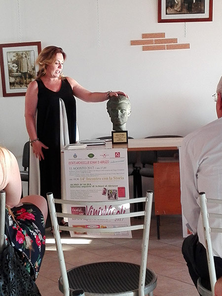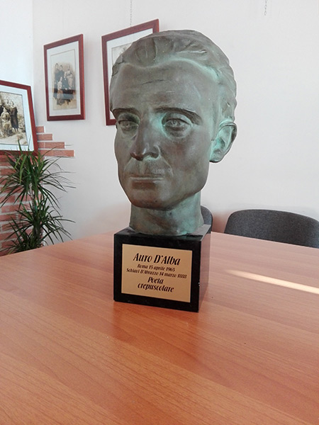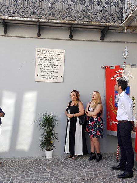 Umberto Bottone, alias Auro D’Alba, l’intellettuale della prima metà del ‘900 e frequentatore dei salotti della cultura italiana, è tornato a Schiavi di Abruzzo. La lapide commemorativa è stata inaugurata oggi 11 agosto in Piazza Vittorio Emanuele, alla presenza della pronipote Patrizia Serafini, del Sindaco di Schiavi di Abruzzo, di Alessandro Tucci autore del libro ‘Auro D’Alba futurista inquieto ‘, dell’Archeoclub ed alcuni Alpini di Castiglione M.M. Auro D’Alba ci ha poi accompagnato nella sala adibita a mostra fotografica permanente, dove lo storico Pasquale Falasca ci ha relazionato sulla figura del poeta e precursore del movimento futurista. E grazie a questo ritorno del compaesano Umberto Bottone, la pronipote Patrizia ha voluto omaggiare la memoria collettiva di Schiavi donando il busto di Auro D’Alba che sarà esposto nella biblioteca del paese.