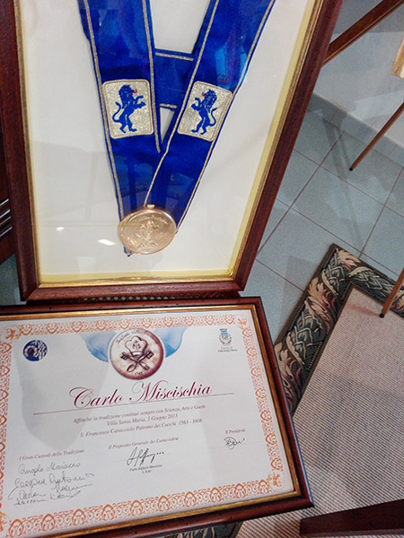 Il buio che risucchia ogni cosa….perchè il Kaos Carlo era capace di creare il buio attorno a sè in occasione di un evento o simposio, dove nessuno era a conoscenza del suo creato fino a quando non si apriva il sipario, risucchiando tutti quegli ingredienti necessari per esprimere al meglio la sua arte culinaria. Quel buio anteriore alla generazione di portate che hanno deliziato palati di addetti al settore e non. Nella mente del Kaos c’era uno ‘Spazio beante, uno Spazio aperto dove l’idea, l’immagine si concretizzava attraverso le sue mani. C’era passione, entusiasmo, amore per la vita, per le piccole cose, per l’amicizia. Generoso e sempre disponibile, caparbio e concreto, ma soprattutto un gran signore. Nel Kaos tangibile della sua Punto bordeaux c’era tutto il suo mondo e tutto trovava e tutto realizzava. Un amico per molti ma non per tutti! Uno, fra tanti, Franco Di Nucci dell’omonimo Caseificio di Agnone, il 5 agosto, ha dedicato la biblioteca tematica a Carlo Miscischia che donò, a suo tempo, preziosi libri dell’arte culinaria, nonché una lettera scritta da suo zio al padre Augusto da cui trae origine, involontariamente, il caciosalame, oggi riprodotto dall’azienda Di Nucci.