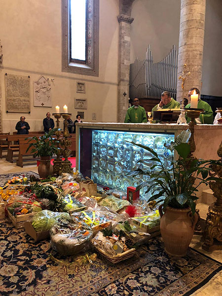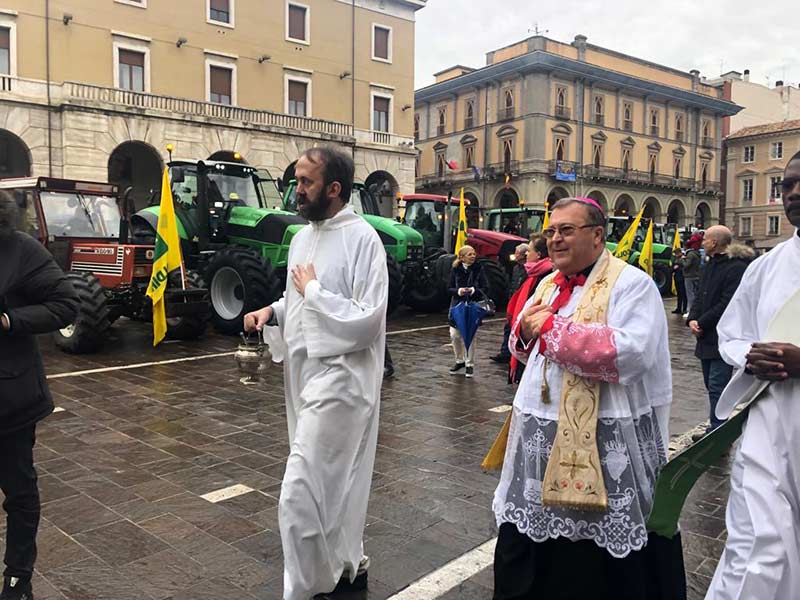Un incontro di riflessione, seguito dalla celebrazione della santa Messa nella cattedrale di Teramo gremita di agricoltori. Nei cesti del tradizionale offertorio tutti i prodotti legati al territorio: olio, vino, ortaggi e confetture, pane e pasta provenienti direttamente dalle campagne con particolare riferimento a quelle colpite dal sisma. Al termine della celebrazione la benedizione dei mezzi agricoli arrivati dalle campagne circostanti nonostante la pioggia e del mercato di Campagna Amica con i produttori agricoli che hanno portato in piazza le migliori eccellenze abruzzesi.