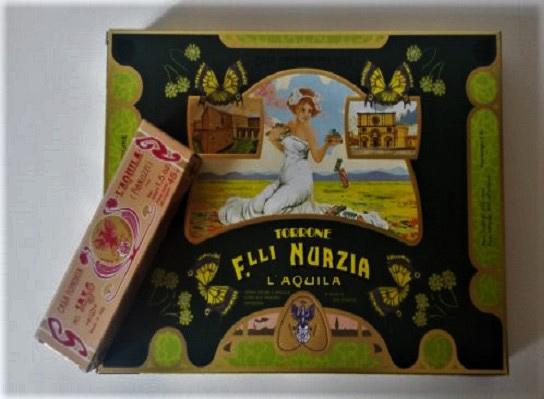 Proprio nel ‘400 dorato aquilano sarebbe spuntato un torrone, certo, privo del cacao, stando allo studio dell’Accademico di cucina Luigi Marra nel 2010. Dunque, col torrone si valorizzava un prodotto della cultura artigianale municipale e che grazie alla credibilità dei suoi creatori, incontrava il gusto del pubblico, per la segretezza della ricetta messa a punto da viaggi in Europa, da Ulisse e qualità finissima dei suoi ingredienti naturali; sicché il dolce aquilano fu meritevole di medaglie e riconoscimenti in diverse esposizioni dolciarie della penisola ed in Svizzera, fino a ricevere elogi di papa Pio X, sin lì, probabilmente, aduso allo zuccherato torrone romano. Una piccola parte del successo riscosso dalle prelibatezze Nurzia, ufficialmente con marchio depositato nel 1910, stava nelle forme di presentazione del prodotto, le cui eleganti confezioni recanti una donna dalla foggia in stile parigino, sottesa ad edificare una torre con le scatole di torrone, erano ad opera di artigiani milanesi; mentre, riguardo alle campagne pubblicitarie, ci si rivolgeva a cataloghi realizzati dalle primissime officine cartarie di tutta la penisola, quelle di San Leucio a Caserta.
