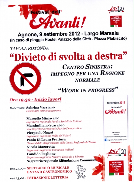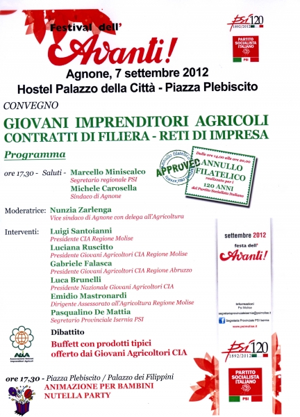 "Giovani agricoltori contratti di filiera e reti d'impresa" , "Violenza, no grazie", " Divieto di svolta a destra" sono i temi del prossimo festival dell'Avanti che si terrà ad Agnone il 7 , 8 e 9 settembre prossimo. L'evento è organizzato dal partito Socialista Italiano e si svolgerà nel palazzo di Città a piazza Plebiscito. Numerosi gli ospiti e addetti ai lavori che hanno aderito alla manifestazione. A fare gli onori di casa il segretario regionale del Psi, Marcello Miniscalco. Inoltre il programma prevede per il 9 settembre un incontro - dibattito a largo Marsala con i segretari regionali dei vari schieramenti politici regionali.