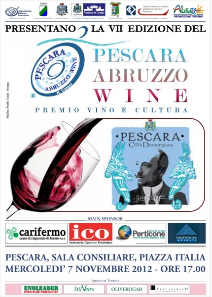 VII Edizione del Pescara Abruzzo Wine, Premio Vino & Cultura, che si terrà il 7 Novembre presso la Sala Consiliare del Comune di Pescara. Tale evento è organizzato ormai da tempo con cadenza annuale dalla Delegazione AIS di Pescara e dal Comune di Pescara e con il Patrocinio della Provincia, della Camera di Commercio, dell' Assessorato all'Agricoltura. Interverranno il Sindaco di Pescara, i Presidenti della Provincia e della Camera di Commercio di Pescara oltre agli Assessori Provinciale e Regionale all'Agricoltura.
