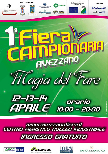 Ad Avezzano dal 12 al 14 Aprile si terrà la 1° Fiera Campionaria ‘Magia del Fare’ nei padiglioni del centro fieristico del consorzio nucleo industriale e con un’area espositiva, interna ed esterna, di circa 8mila metri quadrati. Organizzata dal Comune, dalla Camera di Commercio dell’Aquila e in collaborazione con la Confesercenti, Confartigianato e Confcommercio, vuole rappresentare una vetrina per dare nuovi input alle imprese.