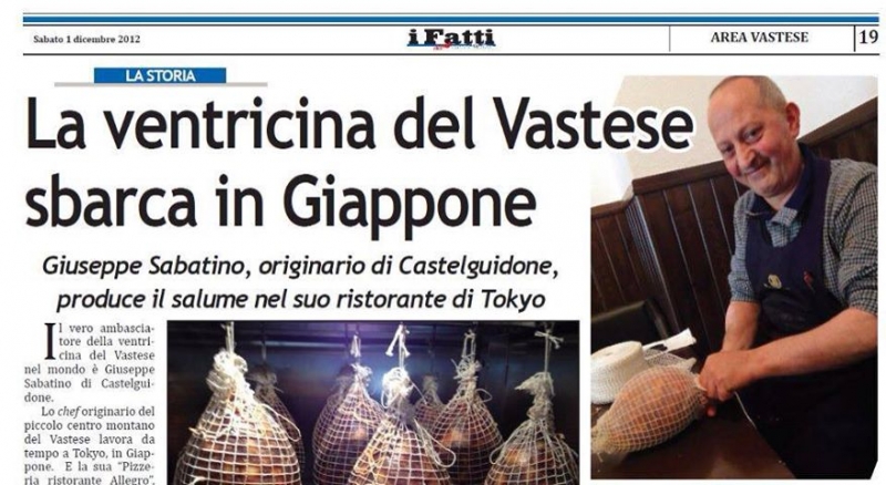 Quando l’amore per la propria terra, la salvaguardia delle tipicità locali e il desiderio di far conoscere le peculiarità abruzzesi oltrepassano i confini e si esprimono a Tokyo. Ed è quello che ha fatto Giuseppe Sabatino , abruzzese doc e titolare di un ristorante in Giappone. Il suo forte attaccamento all’Abruzzo e la conservazione dei sapori ma soprattutto la nostalgia della ventricina, gli hanno permesso di produrre il prelibato salume essendo complicato importarlo dall’Italia. Le carni che utilizza appartengono a maiali simili a quello nero autoctono abruzzese, i kurobuta pork, i maiali più pregiati in Giappone. L’utilizzo del finocchietto selvatico raccolto sulle montagne di Schiavi di Abruzzo, il peperoncino nostrano conferiscono alla ventricina quella gustosità molto apprezzata e ricercata dai clienti del suo ristorante giapponese. E qui entra in scena Davide Fabiano, giovane cuoco presso l’ambasciata italiana a Tokyo ed ex allievo della scuola di Villa Santa Maria (la patria dei cuochi) che fra milioni di persone che popolano Tokyo , ha incontrato Giuseppe Sabatino, un suo conterraneo. Da questa amicizia è nata l’idea di far conoscere questa ventricina in Abruzzo e che ha visto in Davide Fabiano il tedoforo per un tratto decisamente lungo,circa 9800 chilometri. Si attende ora l’analisi gustativa e il giudizio da parte di esperti produttori locali.