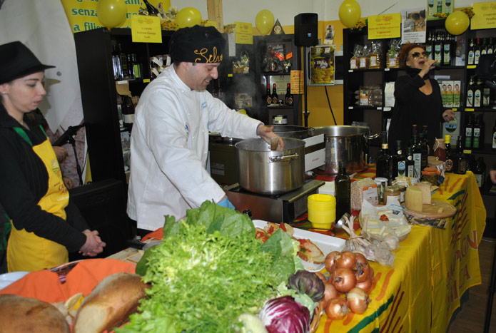 Gran successo per il cooking show dello chef Silvano Pinti nel mercato di Campagna Amica di Pescara tenutosi in occasione della festa della donna. Il cuoco di Francavilla in collaborazione con Campagna Amica e Coldiretti Donne Impresa Abruzzo ha animato la visita delle clienti di via Paolucci con una performance culinaria apprezzata e applaudita. Utilizzando i prodotti freschi dei produttori di Coldiretti, il cuoco ha preparato – ed offerto – i piatti semplici della cucina tradizionale, rivisitandoli estemporaneamente. Così, non solo, pane con cipollina fresca e olio dop, ma anche insalata di indivia, mele, miele e formaggio misto grattugiato, innaffiata da un trebbiano doc; insalata di farro con verdure fresche, sfoglie di formaggi a pasta filata abruzzesi, pasta alla “trappitara” con aglio rosso di sulmona, peperone dolce secco (bastardone) e olive nere di varietà dritta in salamoia.